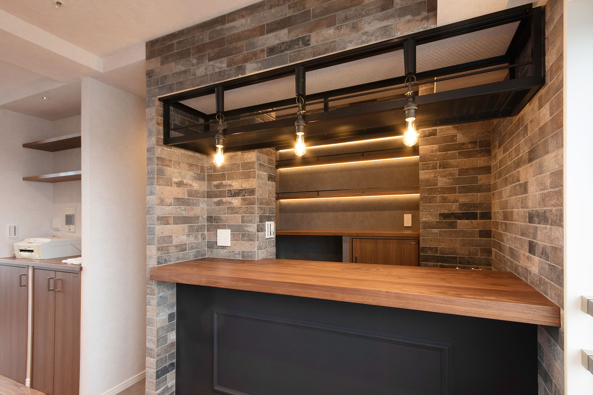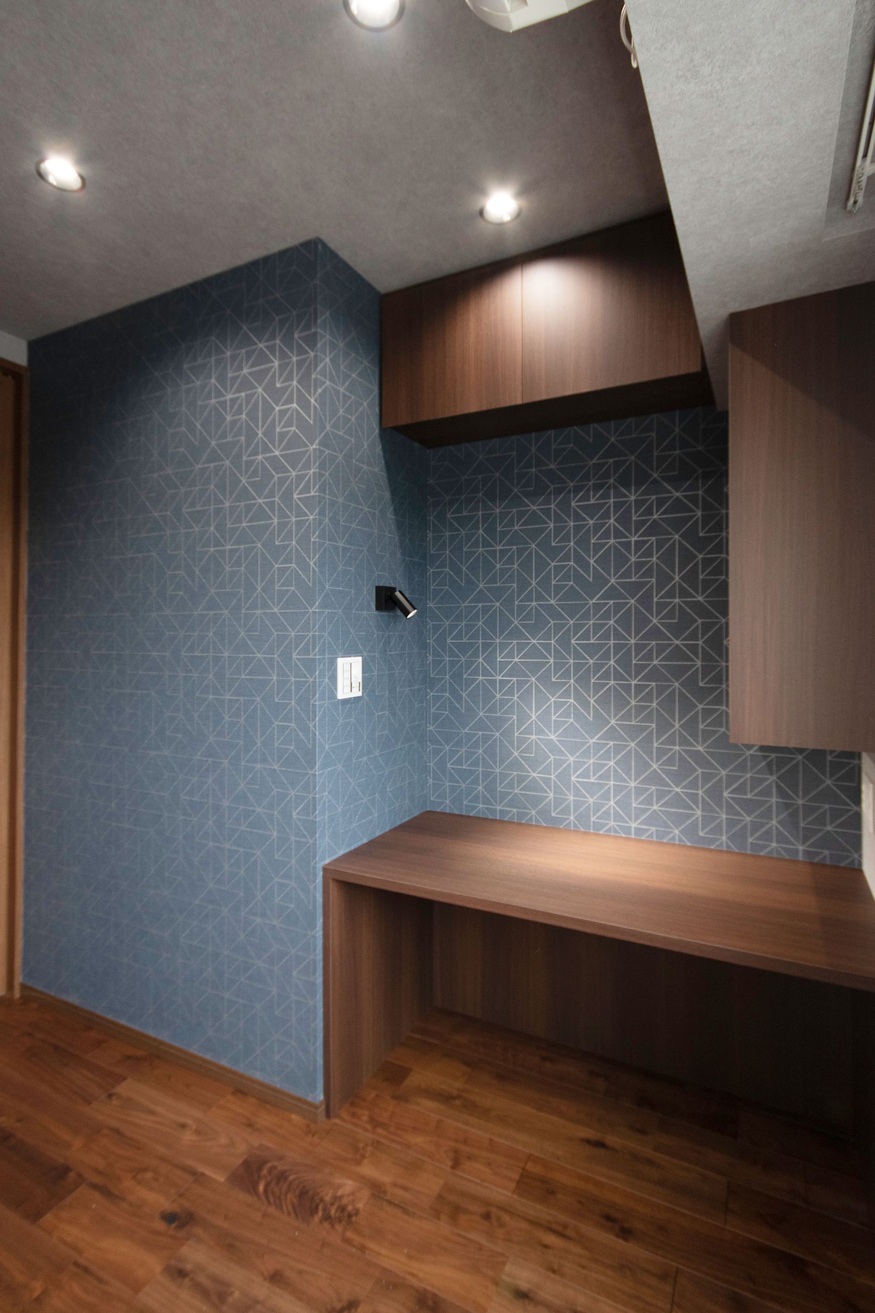 施工写真。ダークブラウンの木目調デスクと吊り戸棚が設置された書斎スペース。壁面には青を基調とした幾何学模様の壁紙が貼られ、天井のダウンライトが手元を明るく照らしている。