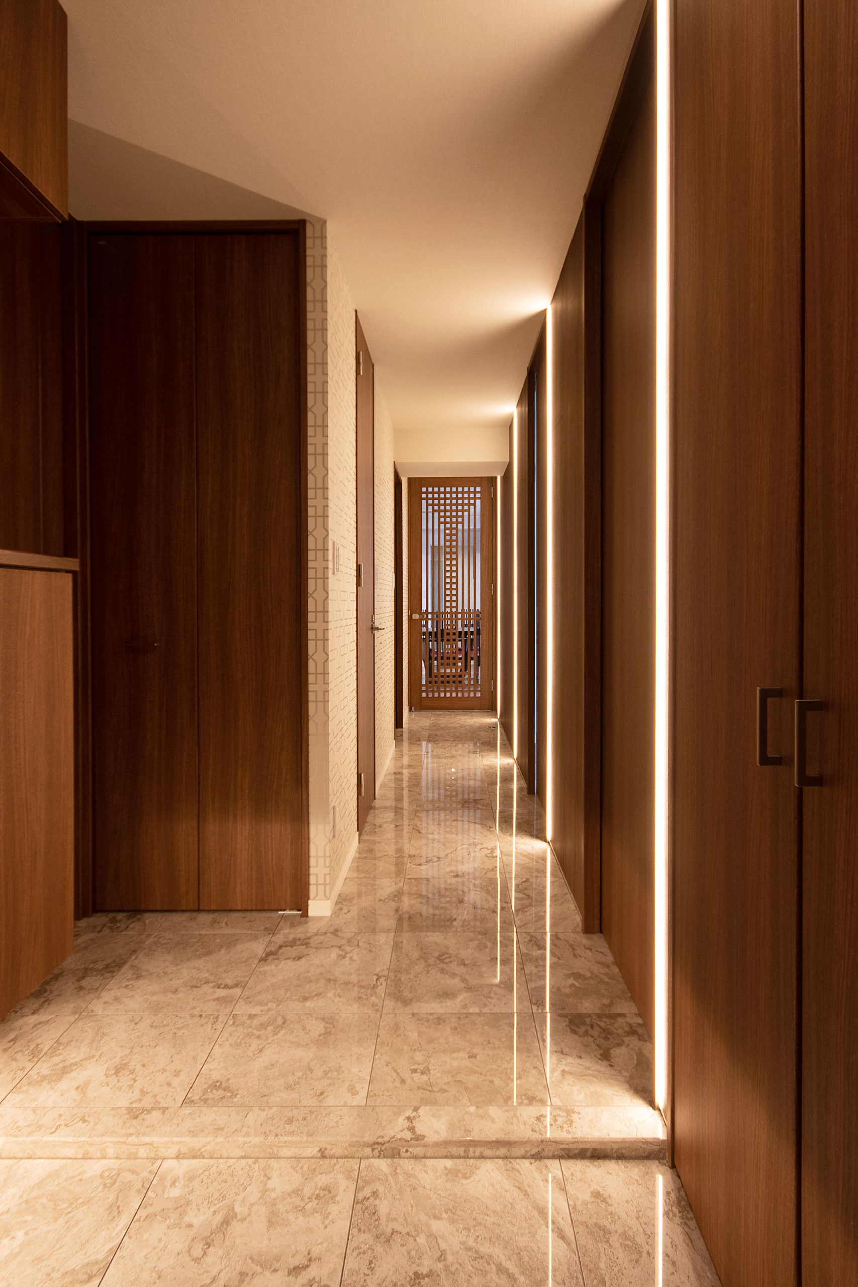 施工写真。艶のある大理石調のタイルが敷かれた真っ直ぐな廊下。両サイドの木目調建具の隙間から縦長の間接照明が床を照らし、奥には装飾的な木製の引き戸が見える。