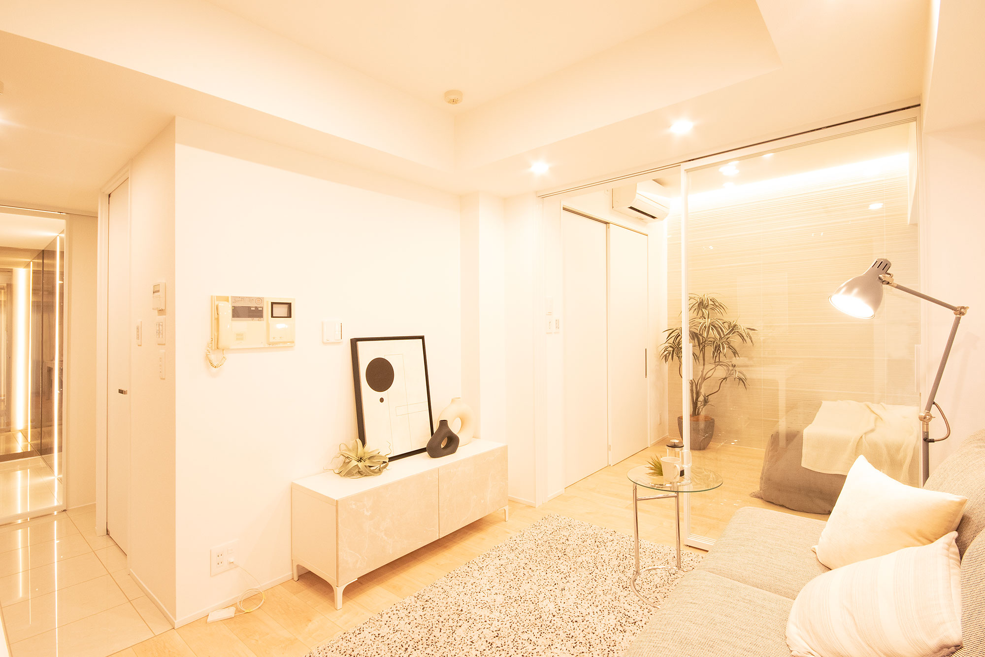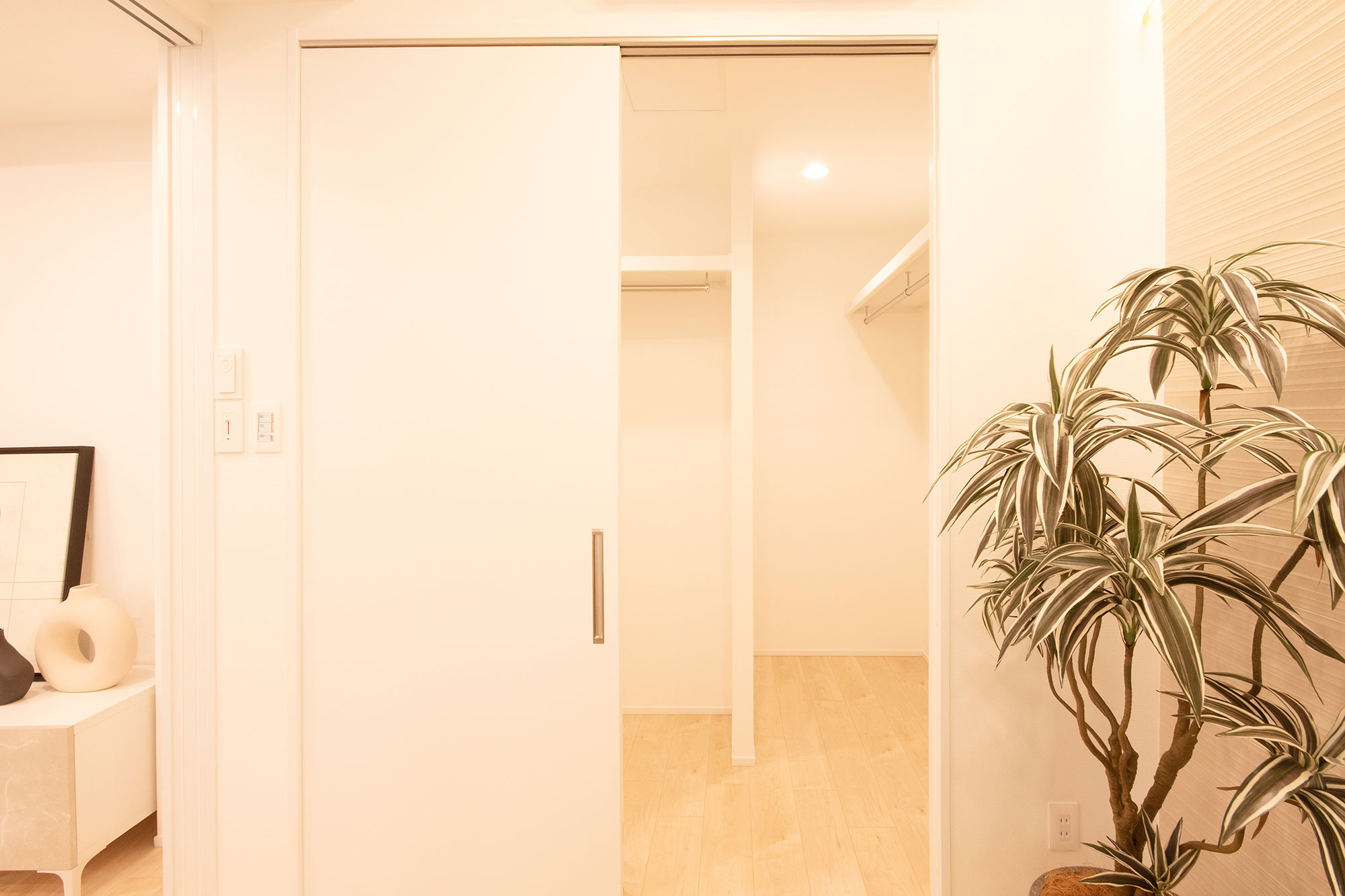 キッチン壁面には、デザイン性と耐久性に優れたアクセントウォールを採用しました。リビングとつながる空間に上質なアクセントを加えつつ、日々のお手入れもスマートになるように工夫しました。クリアガラスの引き戸が生む開放感と、2畳のWICによる高い収納力は43㎡とは思えないゆとりを実現。